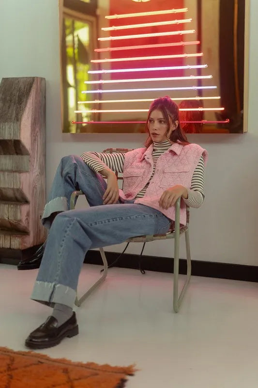 The Texture Quilted Snap Down Vest Coat is a versatile and stylish outerwear piece that offers both warmth and fashion-forward design. The quilted texture adds depth and visual interest to the coat, making it a standout piece. The snap-down closure provides convenience and a modern touch, while the vest style offers layering options for different looks. This coat is perfect for adding an extra layer of warmth and style to your outfit during the cooler months. With its combination of texture, quilting, and snap closures, this vest coat is a chic and functional addition to your wardrobe.