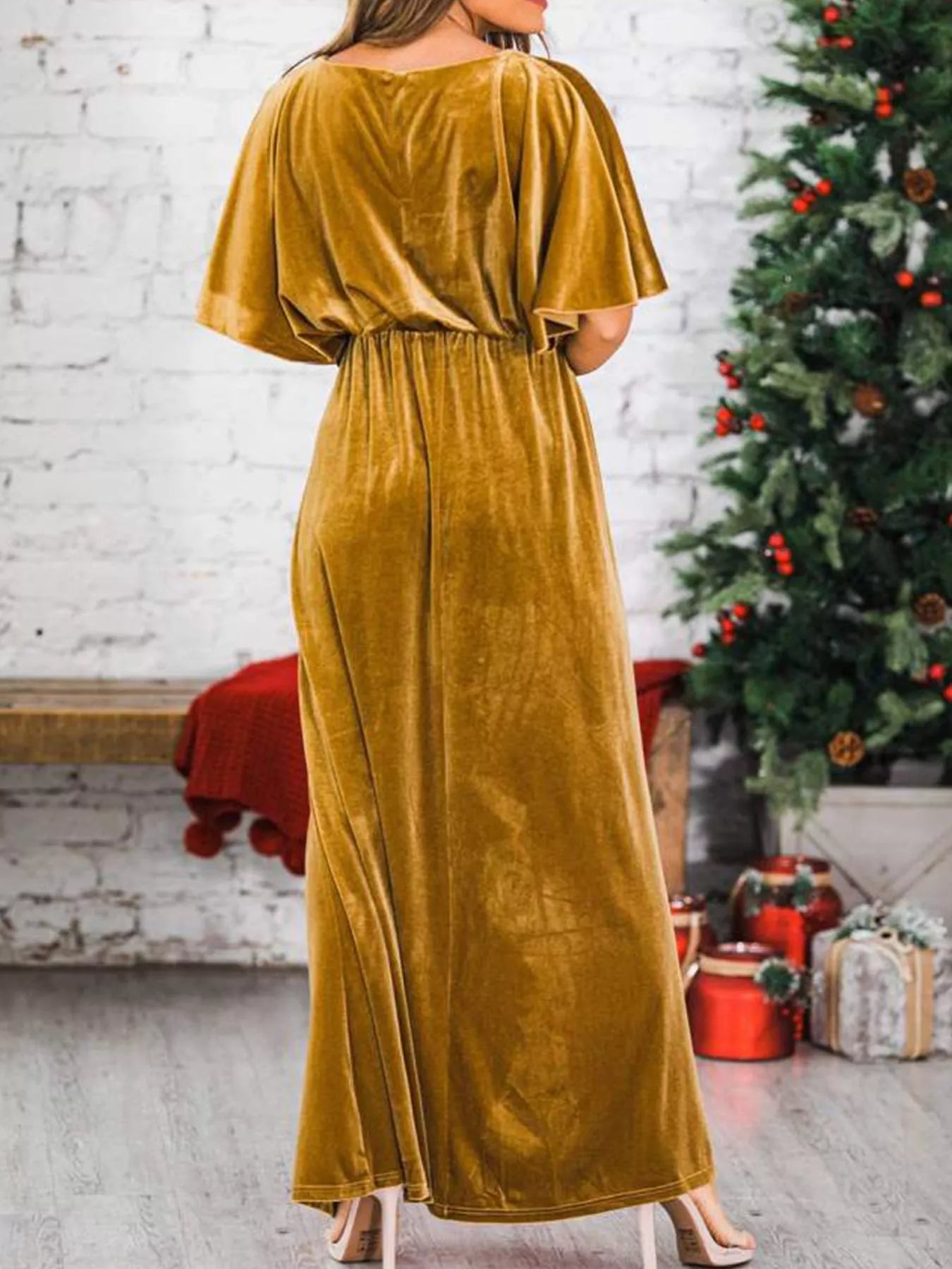 Slit Round Neck Flutter Sleeve Velvet Maxi Dress