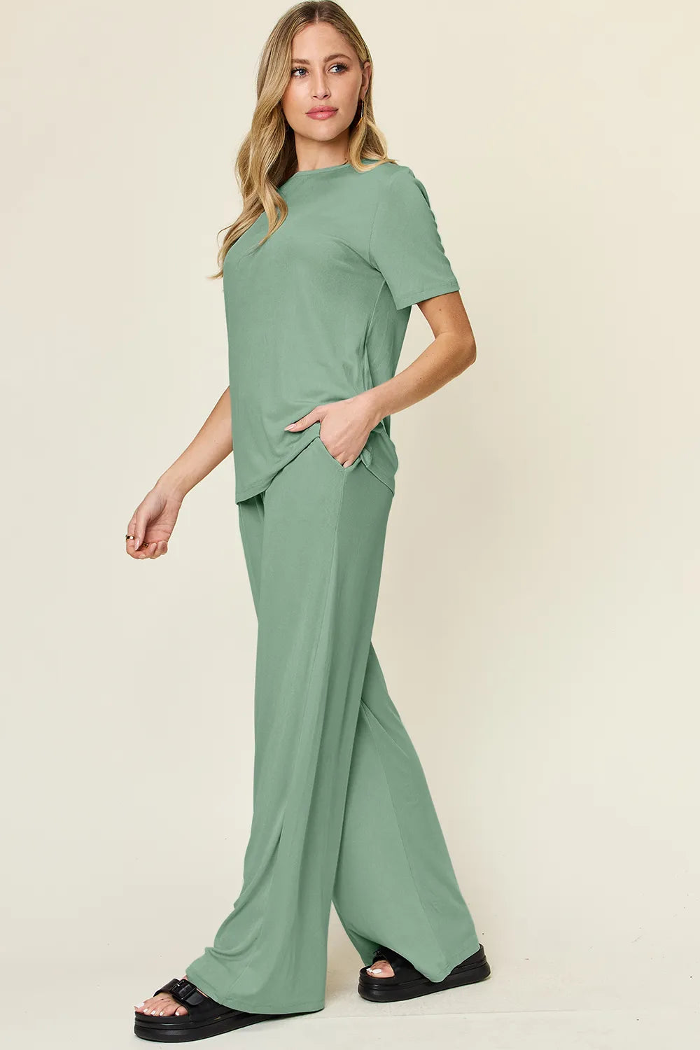 Double Take Full Size Round Neck Short Sleeve T-Shirt and Wide Leg Pan – Fashionfinesse