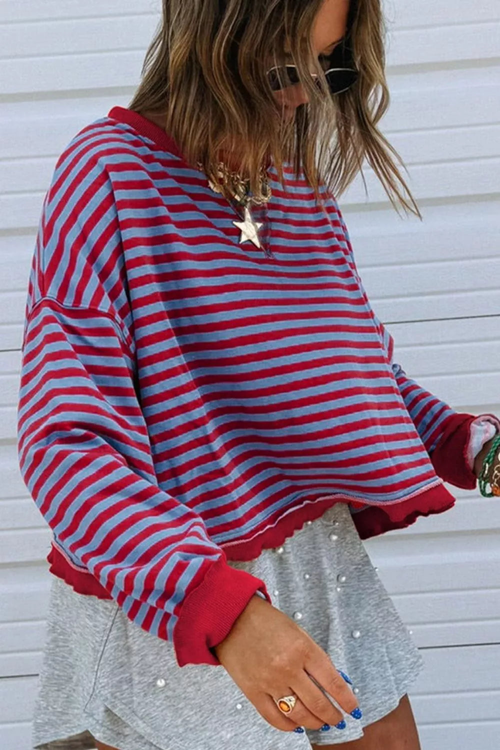 Stripe Exposed Seam Contrast Ribbed Trim Oversize Sweatshirt
